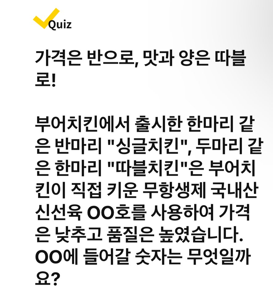 ✅ 가격은 반으로, 맛과 양은 따블로! 부어치킨에서 출시한 한마리 같은 반마리 "싱글치킨", 두마리 같은 한마리 "따블치킨"은 부어치킨이 직접 키운 무항생제 국내산 신선육 OO호를 사용하여 가격은 낮추고 품질은 높였습니다. OO에 들어갈 숫자는 무엇일까요?