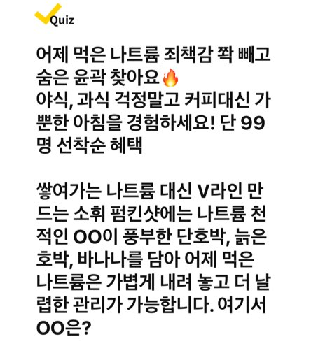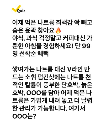 ✅ 어제 먹은 나트륨 죄책감 쫙 빼고 숨은 윤곽 찾아요🔥 야식, 과식 걱정말고 커피대신 가뿐한 아침을 경험하세요! 단 99명 선착순 혜택 쌓여가는 나트륨 대신 V라인 만드는 소휘 펌킨샷이는 나트륨 천적인 칼륨이 풍부한 OOO, 늙은 호박, 바나나를 담아 어제 먹은 나트륨은 가볍게 내려놓고 더 날렵한 관리가 가능합니다. 여기서 OOO은?