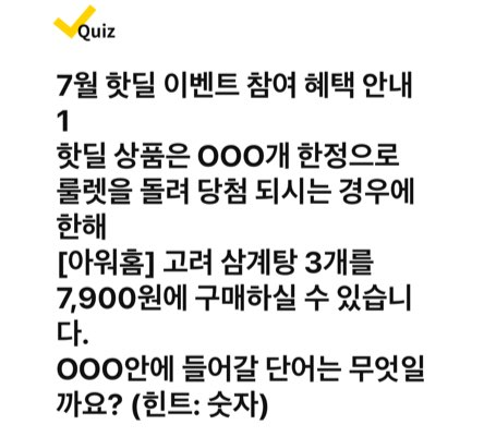 ✅ [뷰티컬리 출석하면 매일 적립금 드려요!] 출석만 해도 매일 100% 당첨되는 7월의 뷰티컬리 출석체크 챌린지! 참여하면 매일 적립금을 드려요! 50원~OOOOO 적립금을 매일 받을 수 있는 기회! 7월 15일부터 21일까지 진행하는 뷰티컬리 출석체크 챌린지 지금 참여하세요! (힌트: 숫자OOO+한글O)