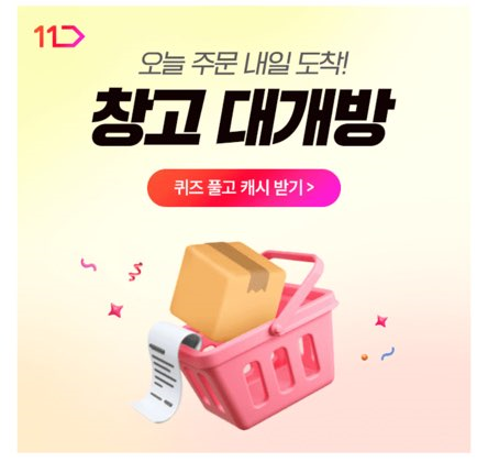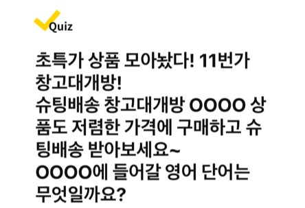 ✅ 초특가 상품 모아놨다! 11번가 창고대개방! 슈팅배송 창고대개방 OOOO 상품도 저렴한 가격에 구매하고 슈팅팅배송 받아보세요~ OOOO에 들어갈 영어 단어는 무엇일까요?