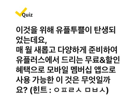 ✅ 이것을 위해 유플투쁠이 탄생되었는데요, 매 월 새롭고다양하게 준비하여 유플러스에서 드리는 무료&할인 혜택으로 모바일 멤버십 앱으로 사용 가능한 이것은 무엇일까요? ( 힌트 : ㅇㅍㄹㅅㅁㅂㅅ)