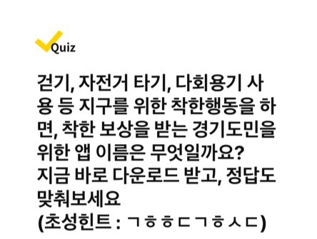 ✅ 걷기, 자전거 타기, 다회용기 사용 등 지구를 위한 착한행동을 하면, 착한 보상을 받는 경기도민을 위한 앱 이름은 무엇일까요? 지금 바로 다운로드 받고, 정답도 맞춰보세요 (초성힌트 : ㄱㅎㅎㄷㄱㅎㅅㄷ)
