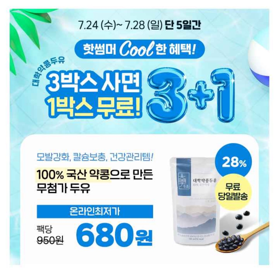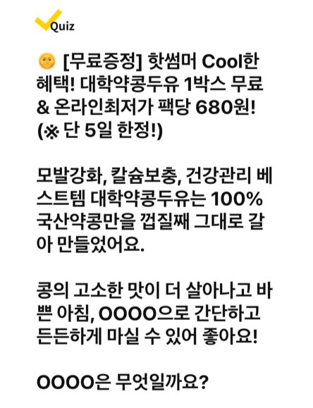 ✅ 🌞 [무료증정] 핫썸머 Cool한 혜택! 대학약콩두유 1박스 무료 & 온라인최저가 팩당 680원! (※ 단 5일 한정!) 모발강화, 칼슘보충, 건강관리 베스트템 대학약콩두유는 100% 국산약콩만을 껍질째 그대로 갈아 만들었어요. 콩의 고소한 맛이 더 살아나고 바쁜 아침, OOOO으로 간단하고 든든하게 마실 수 있어 좋아요! OOOO은 무엇일까요?