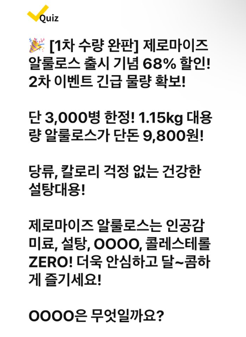 ✅ [1차 수량 완판] 제로마이즈 알룰로스 출시 기념 68% 하인! 2차 이벤트 긴급 물량 확보! 단 3,000병 한정! 1.15kg 대용량 알룰로스가 단돈 9,800원! 제로마이즈 알룰로스는 대용량 1.15kg으로 넉넉하게 사용 가능합니다. 설탕보다 더 맛있고 달콤한데 건강한 대용량 알룰로스로 더욱 OOO으로 즐겨보세요! OOO은 무엇일까요?