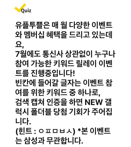✅ 유플투쁠은 매 월 다양한 이벤트와 멤버십 혜택을 드리고 있는데요, 7월에도 통신사 상관없이 누구나 참여 가능한 키워드 릴레이 이벤트를 진행중입니다! 빈칸에 들어갈 글자는 이벤트 참여를 위한 키워드 중 하나로, 검색 캡쳐 인증을 하면 NEW 갤럭시 폴더블 당첨 기회가 주어집니다. (힌트 : ㅇㅍㅁㅂㅅ)
