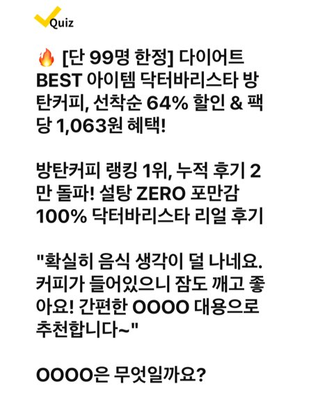 ✅ [단 99명 한정] 다이어트 BEST 아이템 닥터바리스타 방탄커피, 선착순 64% 할인 & 팩당 1,063원 혜택! 이젠 닥터바리스타로 더 맛있고 건강하게 다이어트 시작하세요! 닥터바리스타는 더 가볍게, 더 OOOO 내 몸을 달래주고 힘을 내기 위해서 영양은 듬북, 설탕 0g, 포만감 100% 담았습니다! OOOO은 무엇일까요?