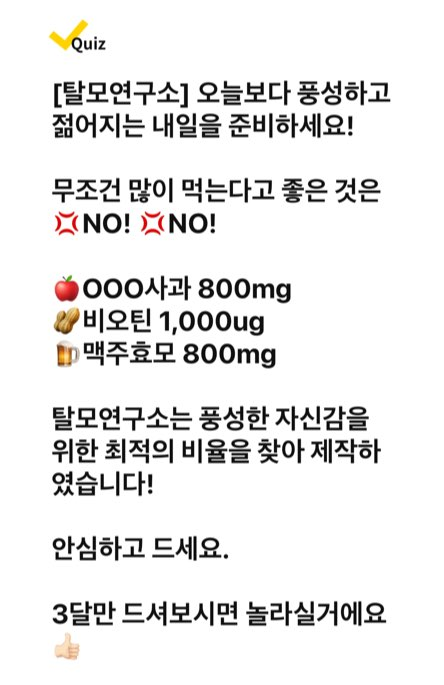 ✅ [탈모연구소] 오늘보다 풍성하고 젊어지는 내일을 준비하세요! 무조건 많이 먹는다고 좋은것은 💢NO! 💢NO! 🍎OOO사과 800mg 🥜비오틴 1,000ug 🍺맥주효모 800mg 탈모연구소는 풍성한 자신감을 위한 최적의 비율을 찾아 제작하였습니다. 안심하고 드세요. 3달만 드셔보시면 놀라실거에요