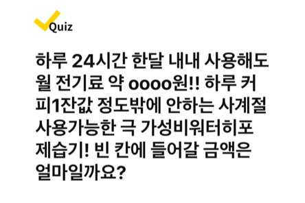 ✅ 하루 24시간 한달 내내 사용해도 월 전기료 약 OOOO원!! 하루 커피 1잔값 정도밖에 안하는 사계절 사용가능한 극 가성비워터히포제습기! 빈 칸에 들어갈 금액은 얼마일까요?
