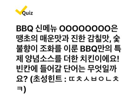 ✅ BBQ 신메뉴 OOOOOOOO은 땡초의 매운맛과 진한 감칠맛, 숯불향이 조화를 이룬 BBQ만의 특제 양념소스를 더한 치킨이에요! 빈칸에 들어갈 단어는 무엇일까요? (초성힌트 : ㄸㅊㅅㅂㅇㄴㅊㅋ)