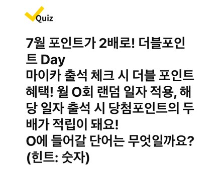 ✅ 7월 포인트가 2배로! 더블포인트 Day 마이카 출석 체크 시 더블 포인트 혜택! 월 O회 랜덤 일자 적용, 해당 일자 출석 시 당첨 포인트의 두배가 적립이 돼요! O에 들어갈 단어는 무엇일까요? (힌트 : 숫자)
