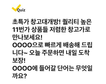 ✅ 초특가 창고대개방! 퀄리티 높은 11번가 상품들 저렴한 창고가로 만나보세요! OOOO으로 빠르게 배송해드립니다~ 오늘 주문하면 내일 도착 보장! OOOO에 들어갈 단어는 무엇일까요?