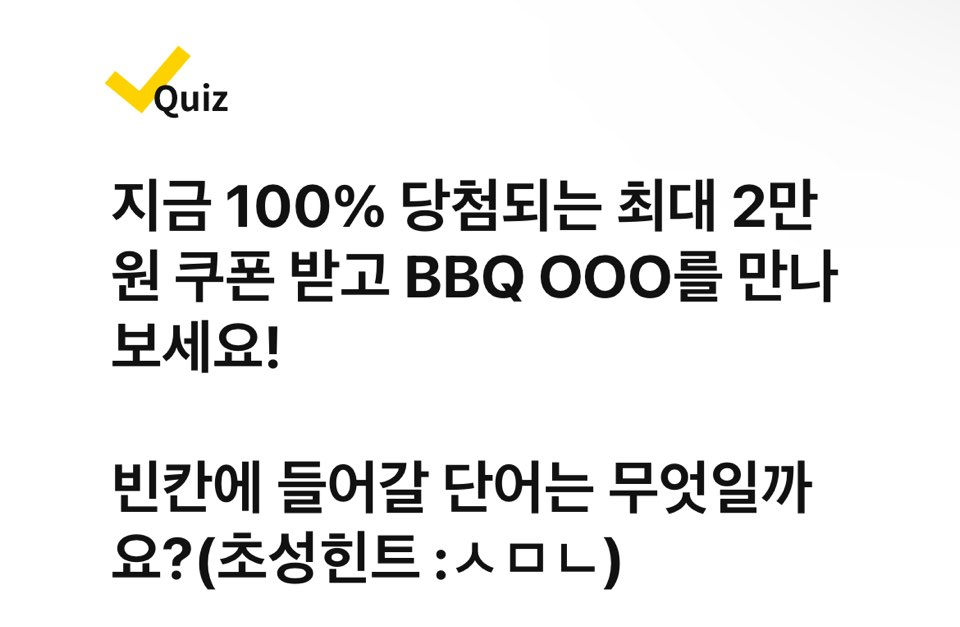 ✅ 지금 100% 당첨되는 최대 2만원 쿠폰 받고 BBQ OOO를 만나보세요! 빈칸에 들어갈 단어는 무엇일까요? (초성힌트 : ㅅㅁㄴ)