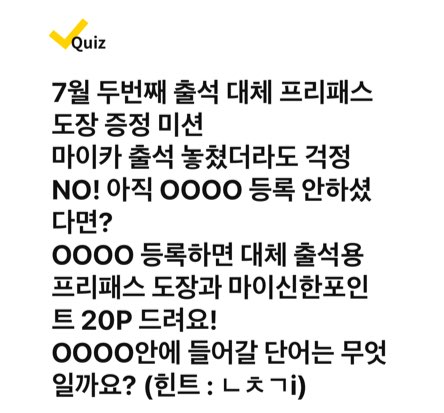 ✅ 7월 두번째 출석 대체 프리패스 도장 증정 미션 마이카 출석 놓쳤더라도 걱정 NO! 아직 OOOO 등록 안하셨다면? OOOO 등록하면 대체 출석용 프리패스 도장과 마이신한포인트 20P 드려요! OOOO안에 들어갈 단어는 무엇일까요? (힌트 : ㄴㅊㄱi)