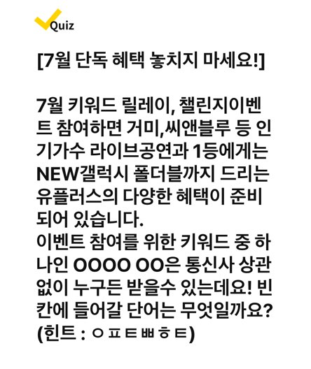 ✅ [7월 단독 혜택 놓치지 마세요!] 7월 키워드 릴레이, 챌린지이벤트 참여하면 거미, 씨앤블루 등 인기가수 라이브공연과 1등에게는 NEW 갤럭시 폴더블까지 드리는 유플러스의 다양한 혜택이 준비되어 있습니다. 이벤트 참여를 위한 키워드 중 하나인 OOOOOO은 통신사 상관없이 누구나 받을 수 있는데요! 빈칸에 들어갈 단어는 무엇일까요? (힌트 : ㅇㅍㅌㅃㅎㅌ)