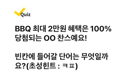 ✅ BBQ 최대 2만원 혜택은 100% 당첨되는 OO 찬스에요! 빈칸에 들어갈 단어는 무엇일까요? (초성힌트 : ㅋㅍ)