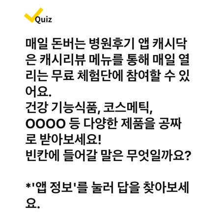 ✅ 매일 돈버는 병원후기 앱 캐시닥은 캐시리뷰 메뉴를 통해 매일 열리는 무료 체험단에 참여할 수 있어요. 건강 기능식품, 코스메틱, OOOO 등 다양한 제품을 공짜로 받아보세요! 빈칸에 들어갈 말은 무엇일까요? *'앱정보'를 눌러 답을 찾아보세요.