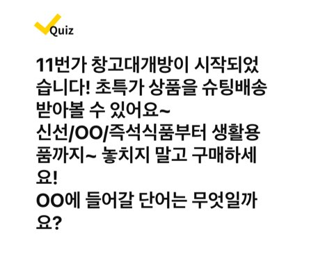 ✅ 11번가 창고대개방이 시작되었습니다! 초특가 상품을 슈팅배송 받아볼 수 있어요~ 신선/OO/즉석식품부터 생활용품까지~ 놓치지 말고 구매하세요! OO에 들어갈 단어는 무엇일까요?