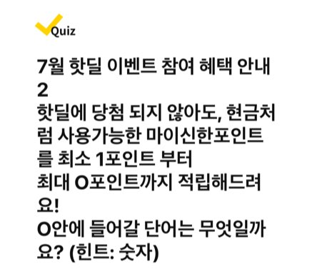 ✅ 7월 핫딜 이벤트 참여 혜택 안내2 핫딜에 당첨되지 않아도, 현금처럼 사용가능한 마이신한포인트를 최소 1포인트부터 최대 O포인트까지 적립해드려요! O안에 들어갈 단어는 무엇일까요? (힌트: 숫자)