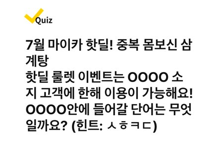 ✅ 7월 마이카 핫딜! 중복 몸보신 삼계탕 핫딜 룰렛 이벤트는 OOOO 소지 고객에 한해 이용이 가능해요! OOOO안에 들어갈 단어는 무엇일까요? (힌트 : ㅅㅎㅋㄷ)