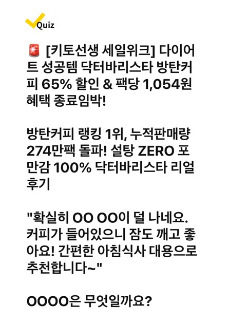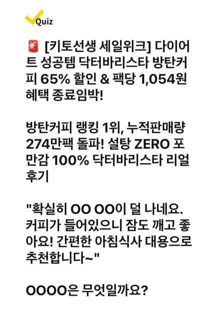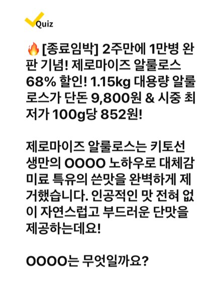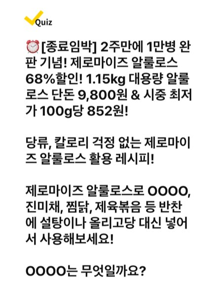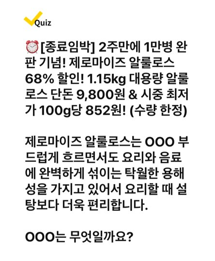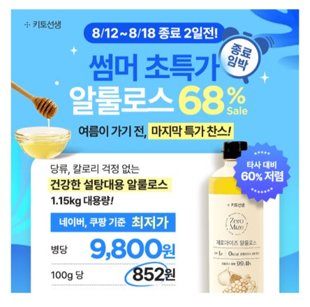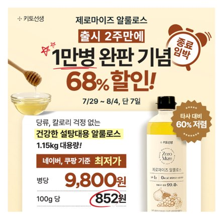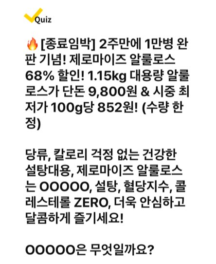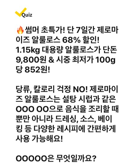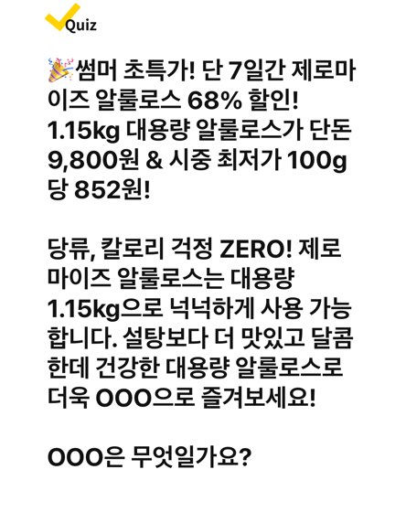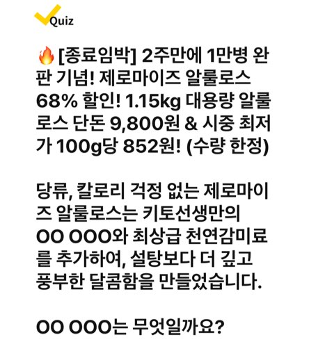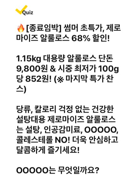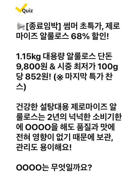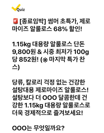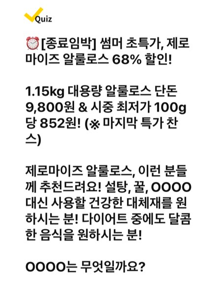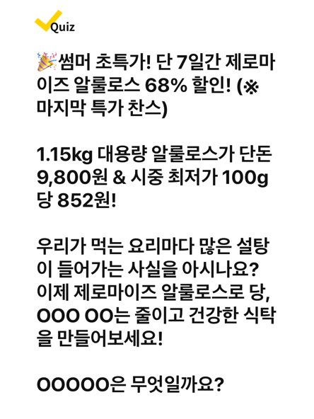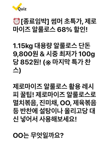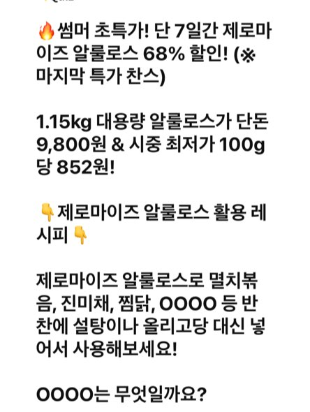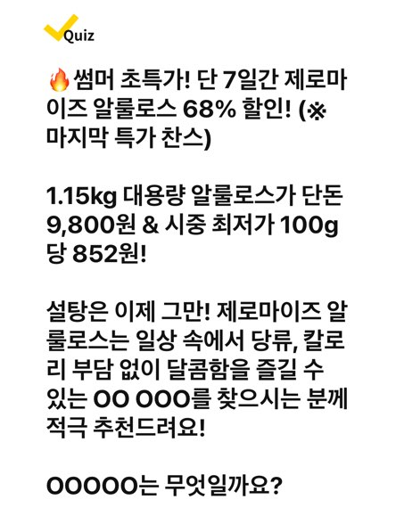 📝 🚨[종료임박] 썸머 초특가, 제로마이즈 알룰로스 68% 할인 1.15kg 대용량 알룰로스 단돈 9,800원 & 시중 최저가 100g당 852원! (※ 마지막 특가 찬스) 당류, 칼로리 걱정 없는 건강한 설탕대용 제로마이즈 알루로스! 설탕보다 더 OOO 달콤한데 건강한 1.15kg 대용량 알룰로스로 더욱 경제적으로 즐겨보세요! OOO는 무엇일까요?