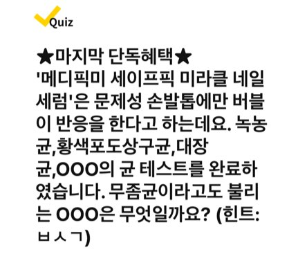 📝 ★마지막 단독혜택★ '메디픽미 세이프픽 미라클 네일세럼'은 문제성 손발톱에만 버블이 반응을 한다고 하는데요. 녹농균, 황색포도상구균, 대장균, OOO의 균 테스트를 완료하였습니다. 무좀균이라고도 불리는 OOO은 무엇일까요? (힌트 : ㅂㅅㄱ)
