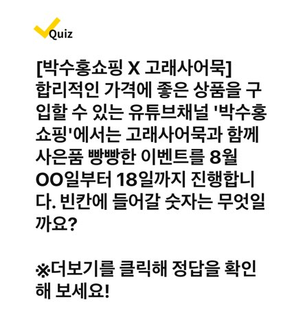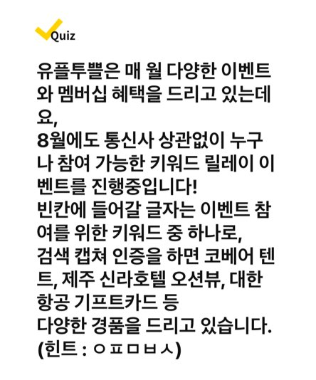 📝 유플투쁠은 매 월 다양한 이벤트와 멤버십 혜택을 드리고 있는데요, 8월에도 통신사 상관없이 누구나 참여 가능한 키워드 릴레이 이벤트를 진행중입니다! 빈칸에 들어갈 글자는 이벤트 참여를 위한 키워드 중 하나로, 검색 캡쳐 인증을 하면 코베어 텐트, 제주 신라호텔 오션뷰, 대한항공 기프트카드 등 다양한 경품을 드리고 있습니다. (힌트 : ㅇㅍㅁㅂㅅ)