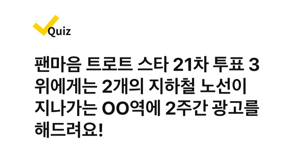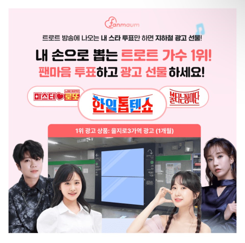 📝 팬마음 트로트 스타 21차 투표 3위에게는 2개의 지하철 노선이 지나가는 OO역에 2주간 광고를 해드려요!