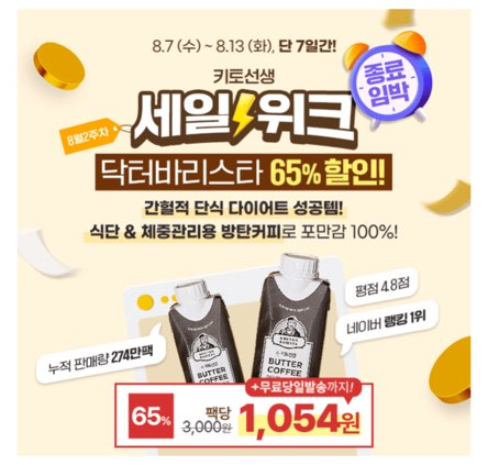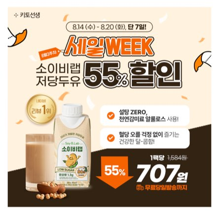📝 🎉[키토선생 세일위크] 설탕ZERO, 천연감미료 알룰로스 사용! 단 7일간 소이비랩 저당두유 55% 할인 & 팩당 707원 특가 찬스 혈당 오를 걱정 없이 즐기는 건강한 저당두유 소이비랩! 가공없이 후기 그대로 보여드릴게요! "제가 먹어본 OOOO 중에 제일 맛있는 두유에요~ 목넘김도 깔끔하고 먹고나면 속도 편해요" OOOO는 무엇일까요?