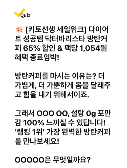 📝 🔥[종료임박] 2주만에 1만병 완판 기념! 제로마이즈 알룰로스 68% 할인! 1.15kg 대용량 알룰로스가 단돈 9,800원 & 시중 최저가 100g당 852원! 제로마이즈 알룰로스는 키토선생만의 OOOO 노하우로 대체감미료 특유의 쓴맛을 완벽하게 제거했습니다. 인공적인 맛 전혀 없이 자연스럽고 부드러운 단맛을 제공하는데요! OOOO는 무엇일까요?