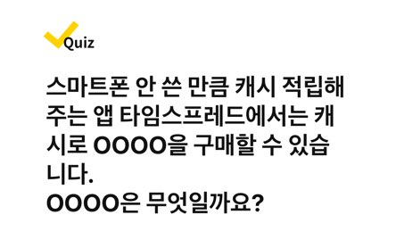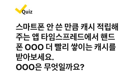 📝 스마트폰 안 쓴 만큼 캐시 적립해주는 앱 타임스프레드에서 핸드폰 OOO 더 빨리 쌓이는 캐시를 받아보세요. OOO은무엇일까요?