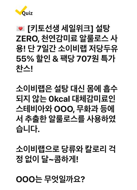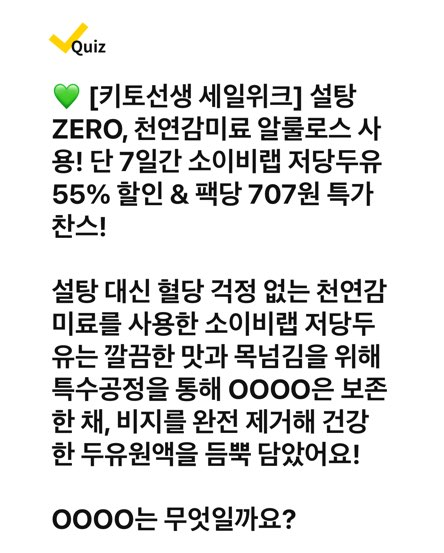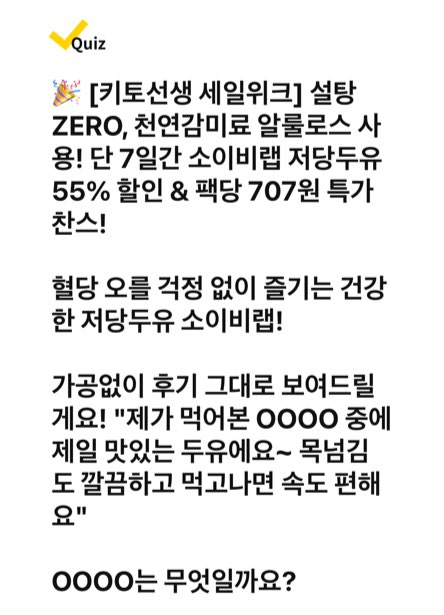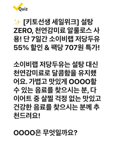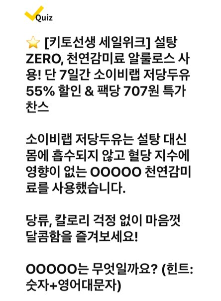 📝 ⭐[키토선생 세일위크] 설탕ZERO, 천연감미료 알룰로스 사용! 단 7일간 소이비랩 저당두유 55% 할인 & 팩당 707원 특가 찬스 소이비랩 저당두유는 설탕 대신 몸에 흡수되지 않고 혈당 지수에 영향이 없는 OOOOO 천연감미료를 사용했습니다. 당류, 칼로리 걱정 없이 마음껏 달콤함을 즐겨보세요! OOOOO는 무엇일까요? (힌트 : 숫자+영어대문자)