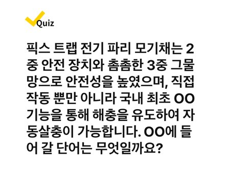 📝 픽스 트랩 전기 파리 모기채는 2중 안전 장치와 촘촘한 3중 그물망으로 안전성을 높였으며, 직접 작동 뿐만 아니라 국내 최초 OO 기능을 통해 해충을 유도하여 자동살충이 가능합니다. OO에 들어갈 단어는 무엇일까요?