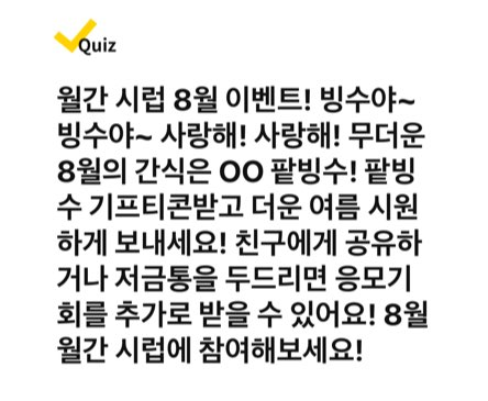 📝 월간 시럽 8월 이벤트! 빙수야~빙수야~ 사랑해! 사랑해! 무더운 8월의 간식은 OO 팥빙수! 팥빙수 기프티콘 받고 더운 여름 시원하게 보내세요! 친구에게 공유하거나 저금통을 두드리면 응모기회를 추가로 받을 수 있어요! 8월 월간 시럽에 참여해보세요!