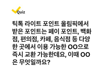 ✅ 틱톡 라이트 포인트 올림픽에서 받은 포인트는 페이 포인트, 백화점, 편의점, 카페, 음식점 등 다양한 곳에서 이용 가능한 OO으로 즉시 교환 가능한데요. 이때 OO은 무엇일까요?