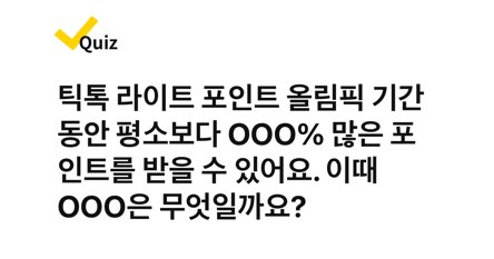 ✅ 틱톡 라이트 포인트 올림픽 기간 동안 평소보다 OOO% 많은 포인트를 받을 수 있어요. 이때 OOO은 무엇일까요?