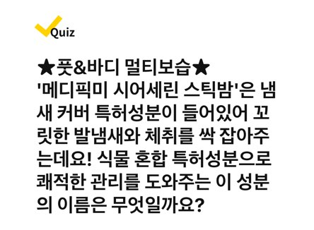 📝 ★풋&바디 멀티보습★ '메디픽미 시어세린 스틱밤'은 냄새 커버 특허성분이 들어있어 꼬릿한 발냄새와 체취를 싹 잡아주는데요! 식물 혼합 특허성분으로 쾌적한 관리를 도와주는 이 성분의 이름은 무엇일까요?