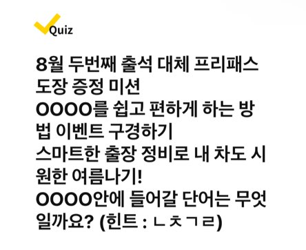 📝 8월 두번째 출석 대체 프리패스 도장 증정 미션 OOOO를 쉽고 편하게 하는 방법 이벤트 구경하기 스마트한 출장 정비로 내 차도 시원하게 여름나기! OOOO안에 들어갈 단어는 무엇일까요? (힌트 : ㄴㅊㄱㄹ)
