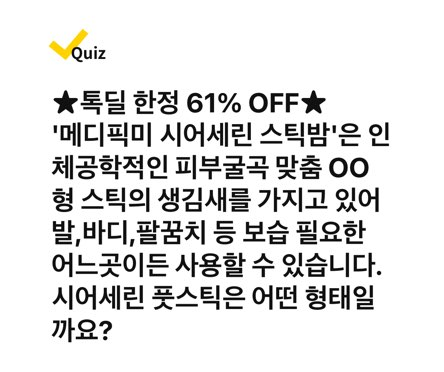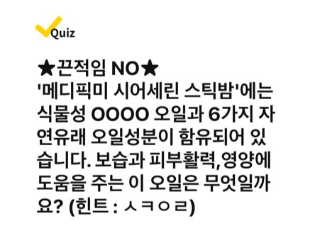 📝 ★끈적임NO★ '메디픽미 시어세린 스틱밤'에는 식물성 OOOO 오일과 6가지 자연유래 오일성분이 함유되어 있습니다. 보습과 피부활력, 영양에 도움을 주는 이 오일은 무엇일까요? (힌트 : ㅅㅋㅇㄹ)