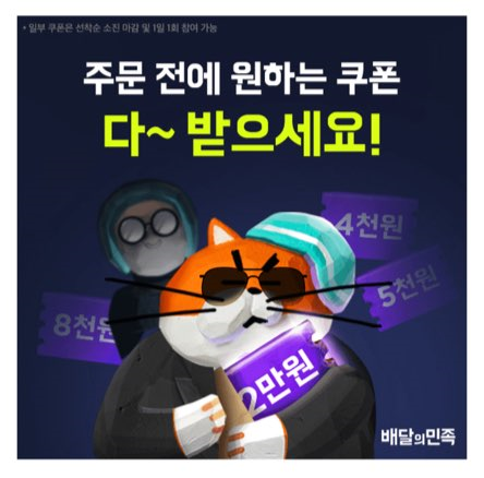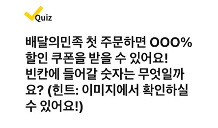📝 배달의민족 첫 주문하면 OOO% 할인 쿠폰을 받을 수 있어요! 빈칸에 들어갈 숫자는 무엇일까요? (힌트 :이미지에서 확인하실 수 있어요!)