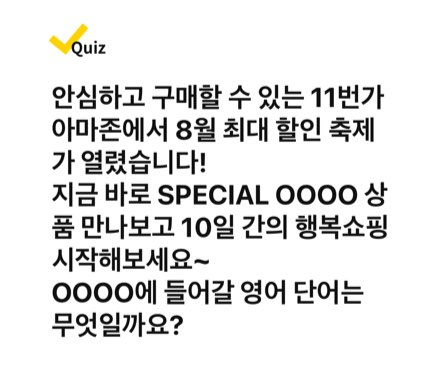 📝 안심하고구매할 수 있는 11번가 아마존에서 8월 최대 할인 축제가 열렸습니다! 지금 바로 SPECIAL OOOO 상품 만나보고 10일 간의 행복쇼핑 시작해보세요~ OOOO에 들어갈 영어 단어는 무엇일까요?
