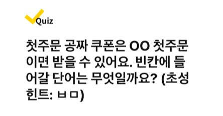 📝 첫주문 공짜 쿠폰은 OO 첫주문이면 받을 수 있어요. 빈칸에 들어갈 단어는 무엇일까요? (초성힌트 : ㅂㅁ)