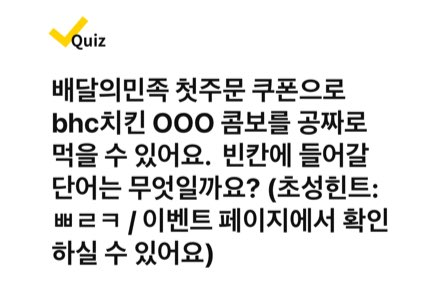 📝 배달의민족 첫주문 쿠폰으로 bhc치킨 OOO 콤보를 공짜로 먹을 수 있어요. 빈칸에 들어갈 단어는 무엇일까요? (초성힌트 : ㅃㄹㅋ / 이벤트 페이지에서 확인하실 수 있어요)