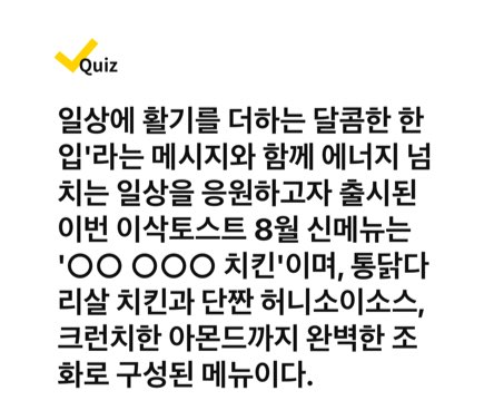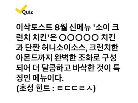 📝 이삭토스트 8월 신메뉴 '소이 크런치 치킨'은 OOOOO 치킨과 단짠 허니소이소스, 크런치한 아몬드까지 완벽한 조화로 구성되어 더 달콤하고 바삭한 것이 특징인 메뉴이다. (초성힌트 : ㅌㄷㄷㄹㅅ)