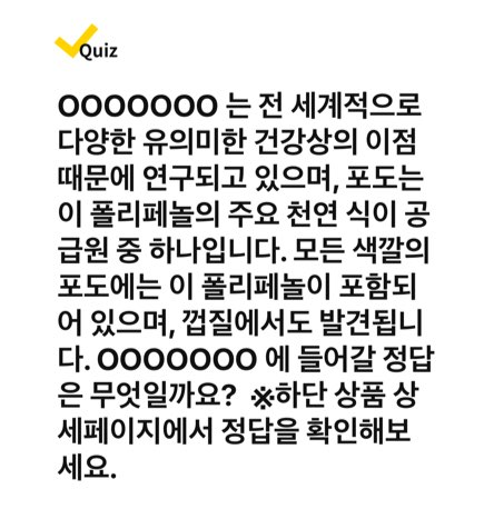 📝 OOOOOOO는 전 세계적으로 다양한 유의미한 건강상의 이점 때문에 연구되고 있으며, 포도는 이 폴리페놀의 주요 천연 식이 공급원 중 하나입니다. 모든 색깔의 포도에는 이 폴리페놀이 포함되어 있으며, 껍질에서도 발견됩니다. OOOOOOO에 들어갈 정답은 무엇일까요?