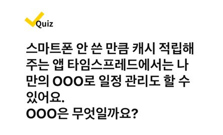 📝 스마트폰 안 쓴 만큼 캐시 적립해주는 앱 타임스프레드에서는 나만의 OOO로 일정 관리도 할 수 있어요. OOO은 무엇일까요?