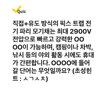 📝 직접+유도 방식의 픽스 트랩 전기 파리 모기채는 최대 2900V 전압으로 빠르고 강력한 OOOO이 가능하며, 캠핑이나 차박, 낚시 등의 야외 활동 시에도 휴대가 간편합니다. OOOO에 들어갈 단어는 무엇일까요? (초성힌트 : ㅅㄱㅅㅊ)