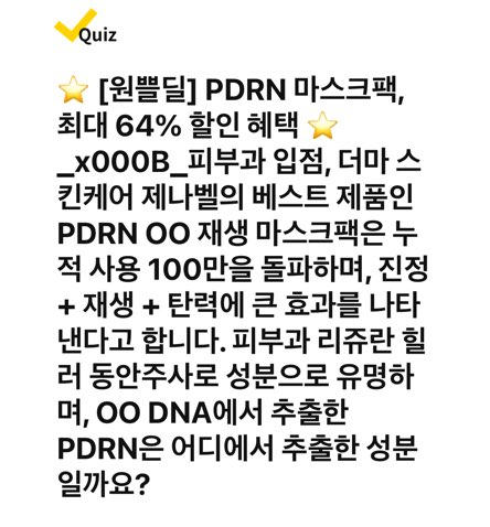 ✅ ⭐[원쁠딜] PDRN 마스크팩, 최대 64% 할인 혜택 ⭐ _x000B_피부과 입점, 더마 스킨케어 제나벨의 베스트 제품인 PDRN OO 재생 마스크팩은 누적 사용 100만을 돌파하며, 진정+재생+탄력에 큰 효과를 나타낸다고 합니다. 피부과 리쥬란 힐러 동안주사로 성분으로 유명하며, OO DNA에서 추출한 PDRN은 어디에서 추출한 성분일까요?