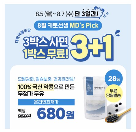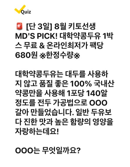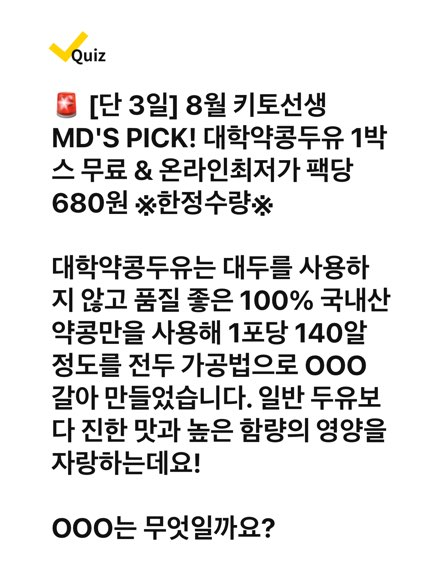 📝 🚨[단 3일] 8월 키토선생 MD'S PICK! 대학약콩두유 1박스 무료 & 온라인최저가 팩당 680원 ※한정수량※ 대학약콩두유는 대두를 사용하지 않고 100% 국내산 약콩만을 사용하였는데요. 첨가물은 빼고 1포당 국내산 약콩을 껍질째 갈아 만들어 일반 두유보다 OOO과 높은 함량의 영양을 자랑합니다. OOO은 무엇일까요?