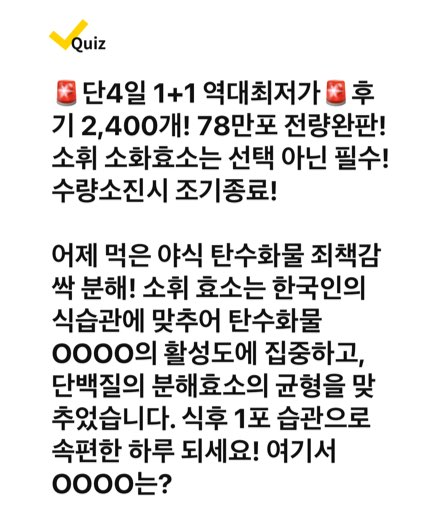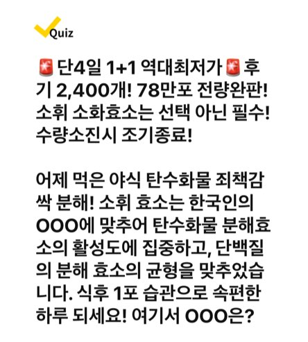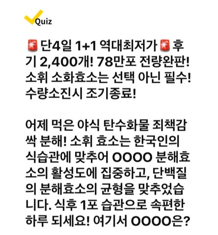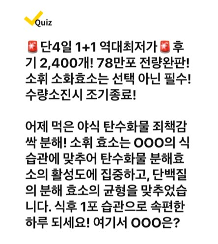 📝 🚨단4일 1+1 역대최저가🚨 후기 2,400개! 78만포 전량완판! 소휘 소화효소는 선택이 아닌 필수! 수량소진시 조기종료! 어제 먹은 야식 탄수화물 죄책감 싹 분해! 소휘 효소는 한국인의 식습관에 맞추어 OOOO 분해효소의 활성도에 집중하고, 단백질의 분해 효소의 균형을 맞추었습니다. 식후 1포 습관으로 속편한 하루 되세요! 여기서 OOO은?