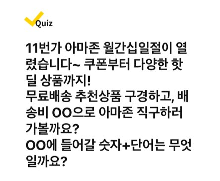 📝 11번가 아마존 월간십일절이 열렸습니다~ 쿠폰부터 다양한 핫딜 상품까지! 무료배송 추천상품 구경하고 , 배송비 OO으로 아마존 직구하러 가볼까요? OO에 들어갈 숫자+단어는 무엇일까요?